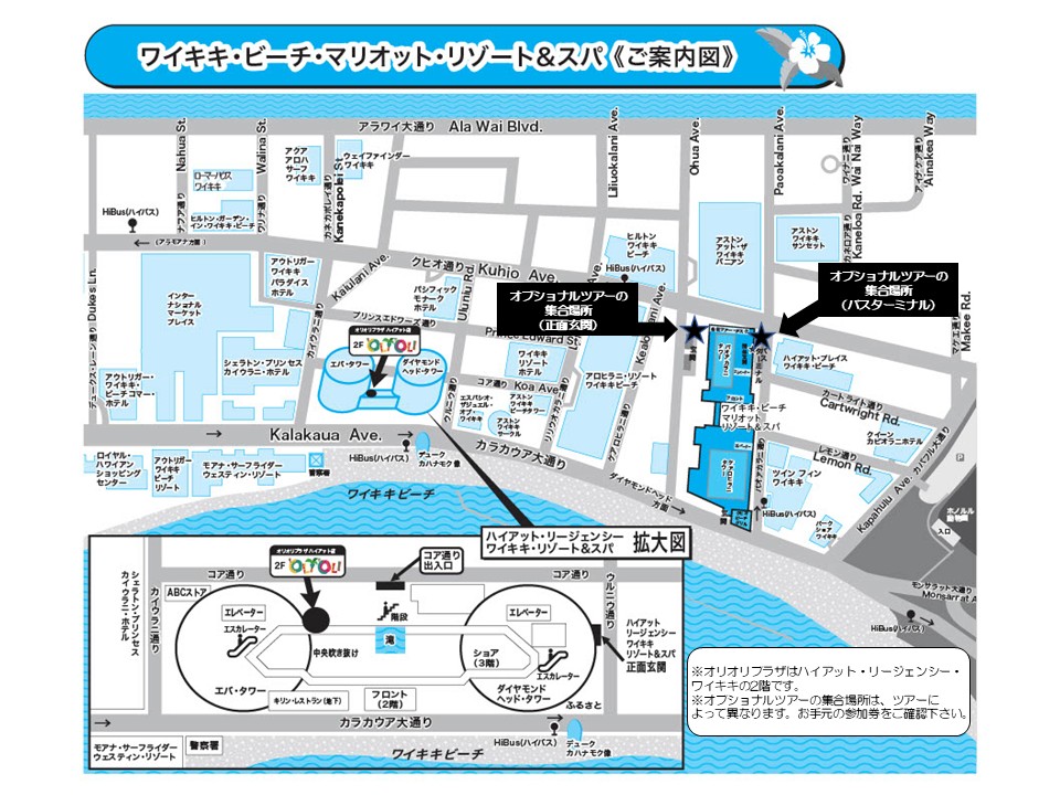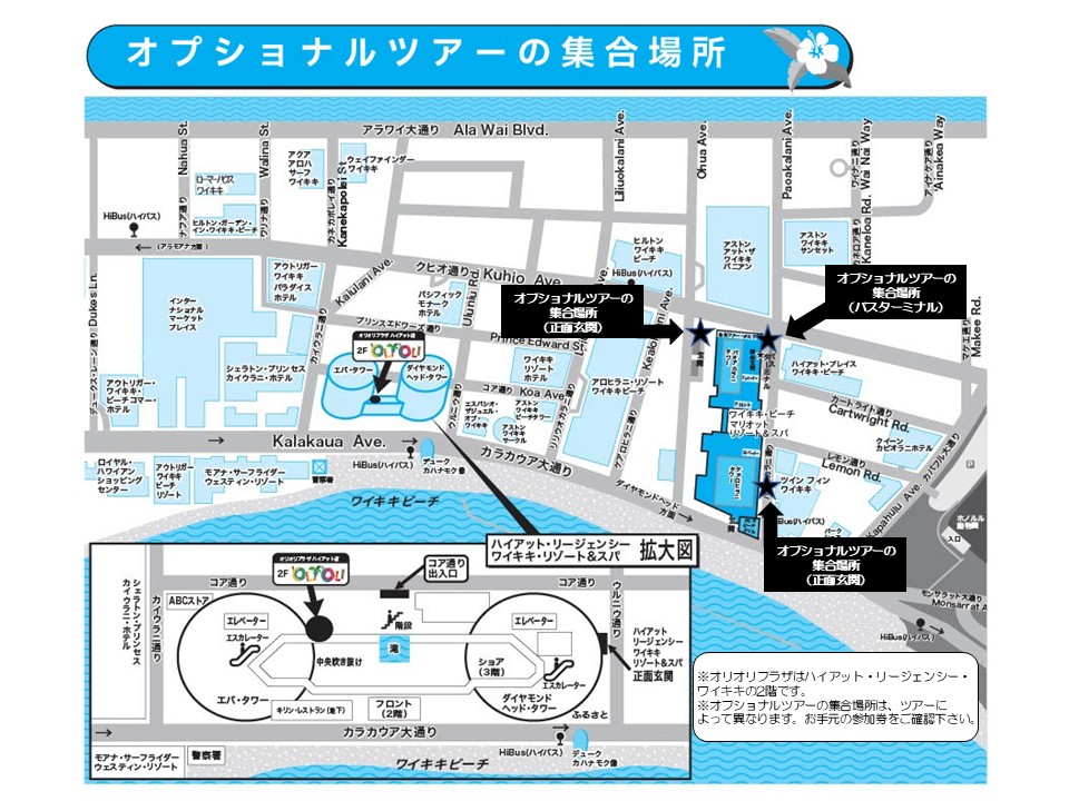 ご参加されるオプショナルツアーによりご集合場所が異なります。お申し込みされたオプショナルツアーのバウチャーまたは参加券(Eチケット)にて、ご集合場所を必ずご確認ください。またパレードや工事により変更になる場合もございますので、ご到着後に再確認されることをお勧めいたします。
